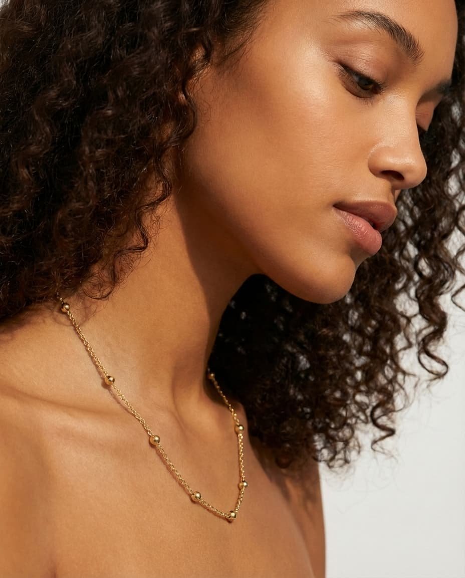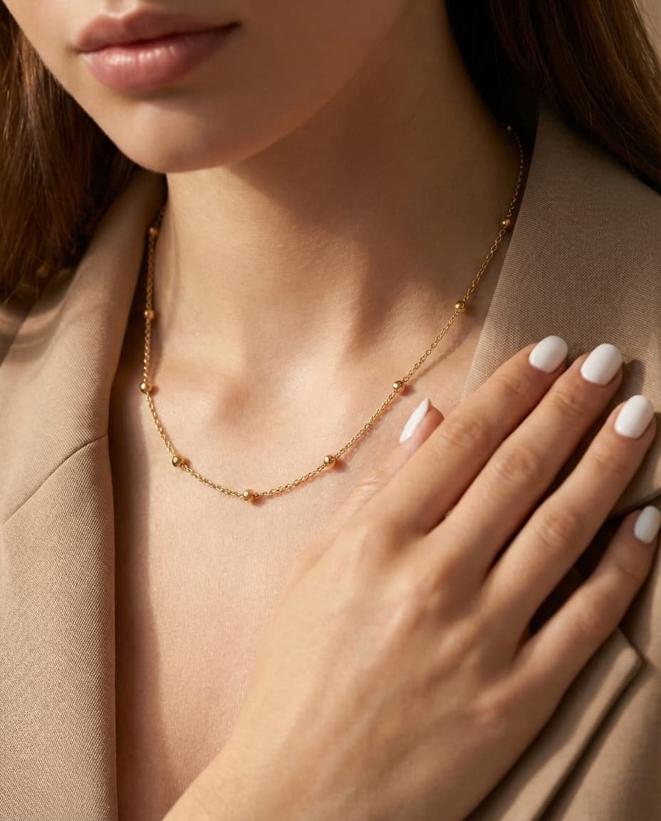 Una cadena con esferas distribuidas que aporta brillo sutil y movimiento.